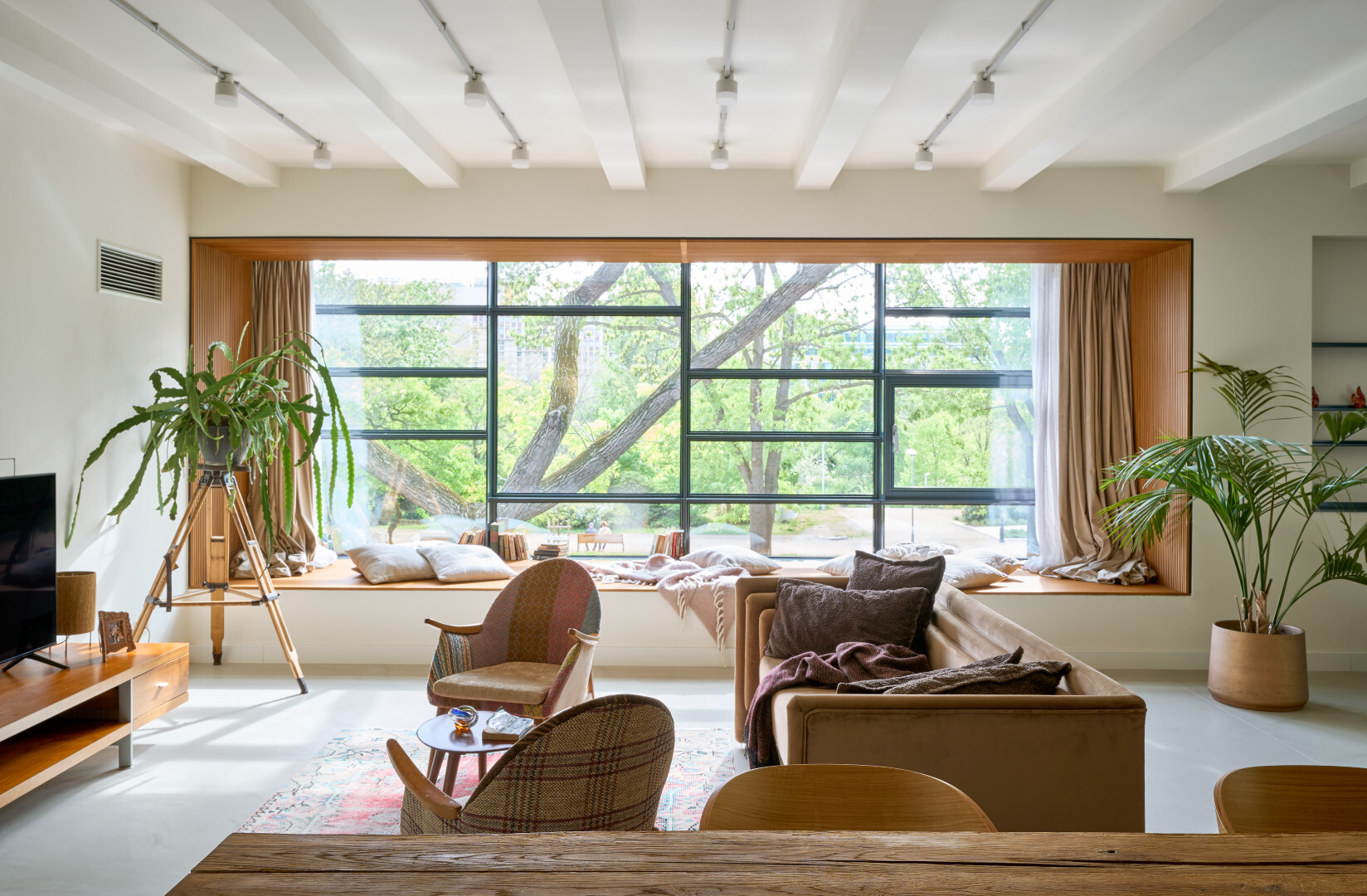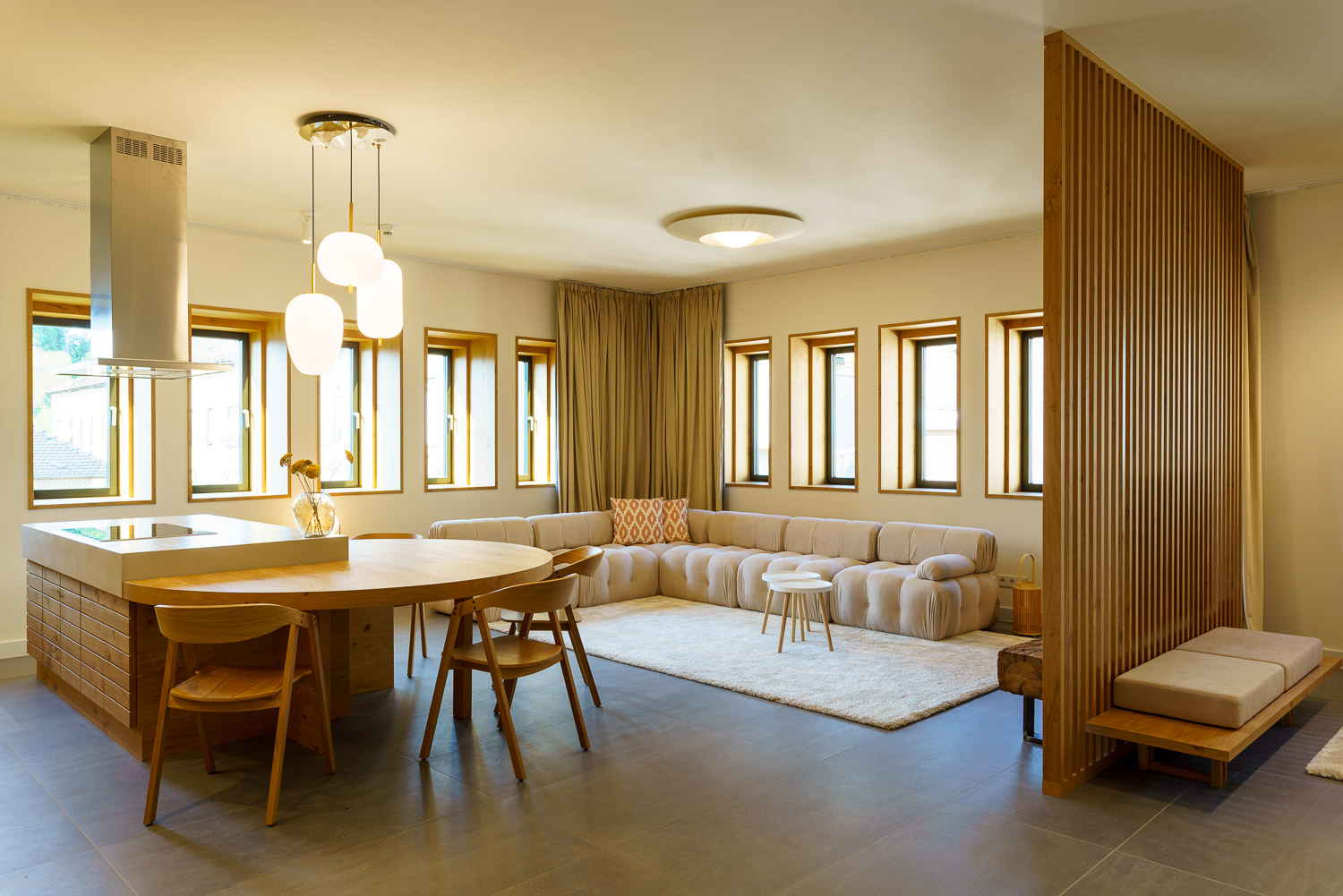 A daruzás elsőre szóba került, de a kisebb ablak méretei ezt kizárták, míg a nagyobb ablak kibontása komoly költséggel és időveszteséggel járt volna. Ekkor született meg a kreatív ötlet: az asztallapot egy szomszédos lakás teraszáról juttattuk a rendeltetési helyére.